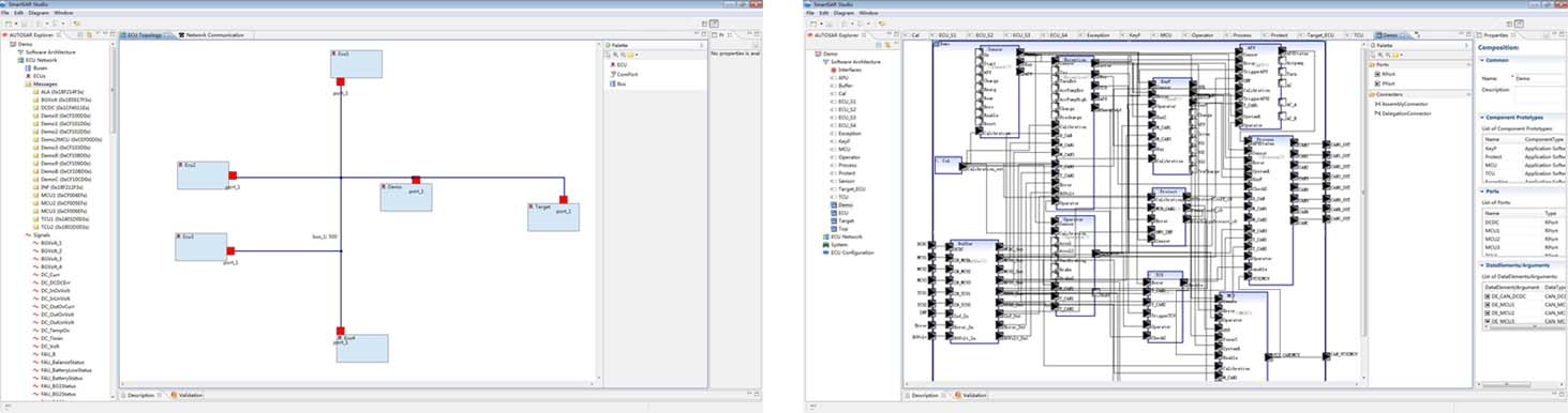 在SmartSAR Studio的设计工具SmartSAR Designer中,可以分别对系统的软件架构、硬件拓扑结构、网络通信等进行图形化设计。在AUTOSAR的分层软件结构与软件组件(Software Component)的思想指引下,开发人员可以从软件系统的角度去定义各个功能模块和功能模块之间的数据交互关系。这样的系统设计可以是只针对单一的一个控制系统的应用(比如纯电动的电机控制器),也可以是针对集成系统级别的应用(比如纯电动的动力总成系统,包括电机控制器MCU,电池管理系统BMU,整车控制器VCU等)。
