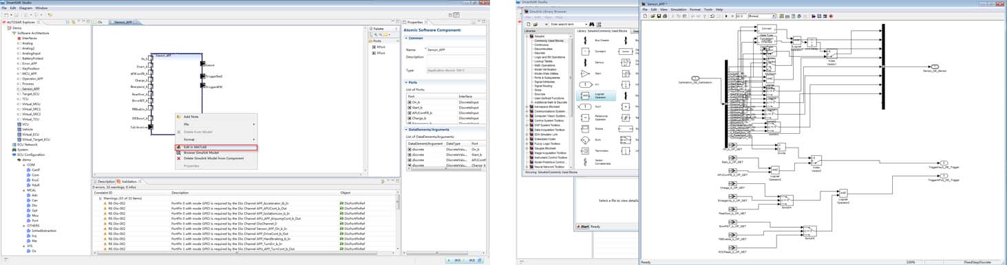 在完成应用层软件组件的架构以及软件组建之间的接口定义之后,通过手写代码,也可以借助于计算机辅助开发软件MATLAB/Simulink,建立可执行控制逻辑的算法框图与状态流程图,对控制器的功能进行详细定义。SmartSAR Studio能与MATLAB/Simulink中开发的内部逻辑无缝集成.
