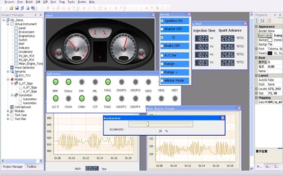 图形化测试软件Smart Controller包括测试操作软件、语义设计器、虚拟仪表设计器、标定数据库设计器、通信设计器组成。