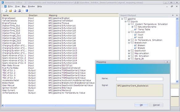 仿真测试准备工作中,面对错综复杂,难以理解的各种信号表示,Smart Controller专门提供了信号语义映射编辑器。在该编辑器中,测试工程师可以通过拖拽方式,快速对模型、CAN总线、LIN总线的输入输出进行语义映射,即指定一个易于辨认的名称,该名称可用于后续的测试虚拟仪表配置、日常测试操作中。