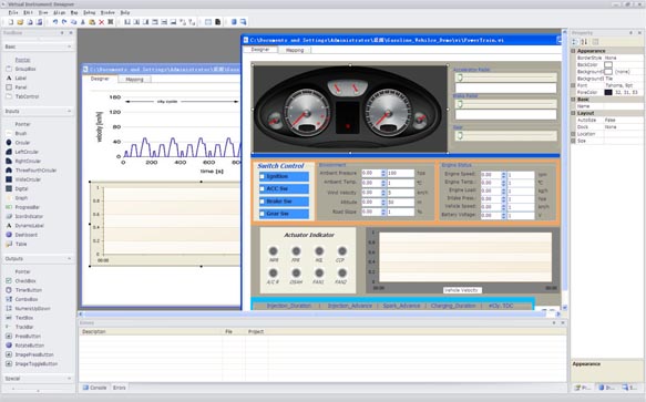在安装好设备后,针对不同机电实时控制系统的测试需求,需要定制图形化的测试界面,以便进行手工测试以及在测试过程中的图形化显示。Smart Controller提供了专门的虚拟界面设计器,支持各种控件库,可以方便制定出各种测试界面,以及用于对I/O板卡的管理和配置,准确实现物理信号和电信号已经模型数据接口直接的映射关系。